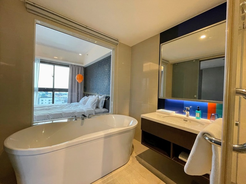 - 部分房型內設有浴缸,並可以在房內看西子灣夕陽,而且走路到駁二特區也很近喔。