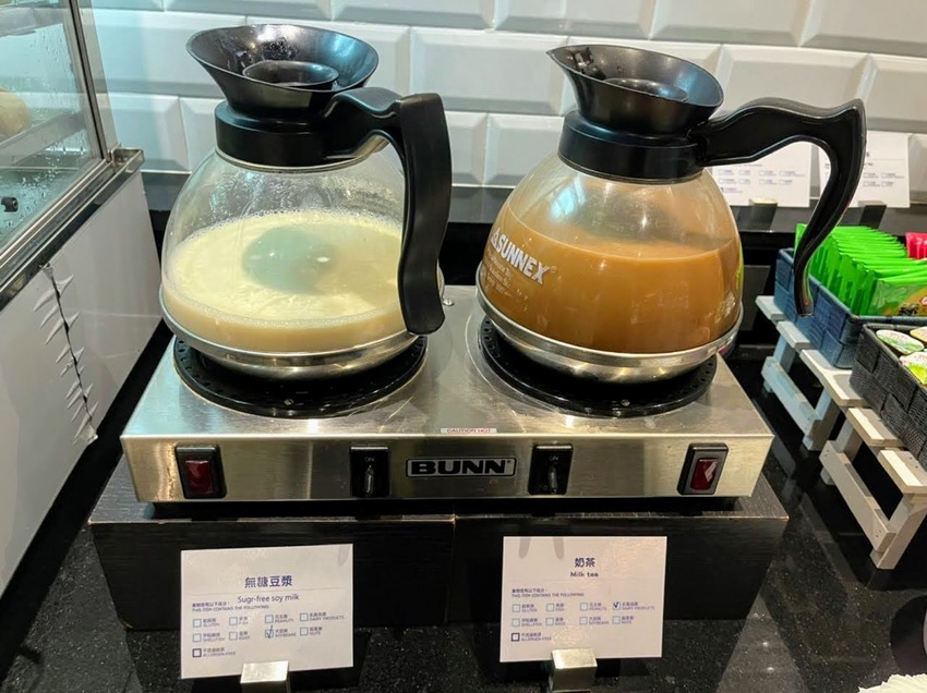 飲料的話則有現磨咖啡、果汁以及無糖豆漿跟奶茶,當然如果你想要喝茶類的話一旁也有提供茶包跟熱水可以供沖泡。