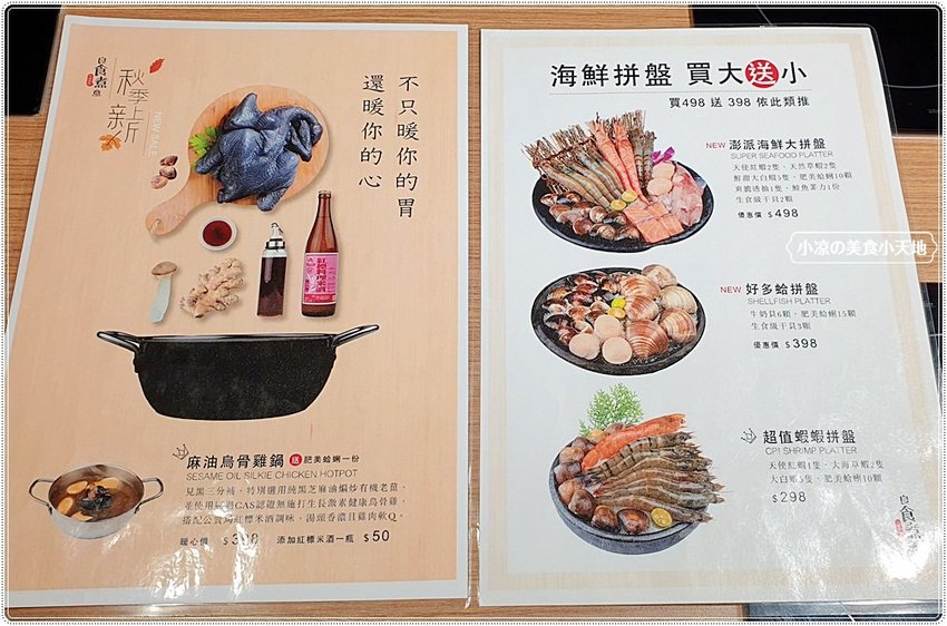 良食煮意秋季新上市湯頭”麻油烏骨雞“絕對讓你暖位滿分,並不定時推出優惠、近期是海鮮拼盤買大送小超級划算!!! 例如買498送398、買398送298以此類推,海鮮控吃起來! (線上訂位)