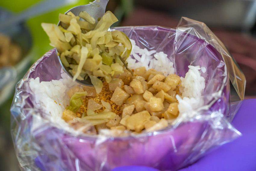 豪華總匯飯糰則是把所有店裡的品項全都包進來了,有牛腱、牛肚、叉燒、雞胸、花生粉、菜酥、酸菜、菜脯、豆皮、滷蛋與油條,如果有不吃的店家也能幫我們客製化。