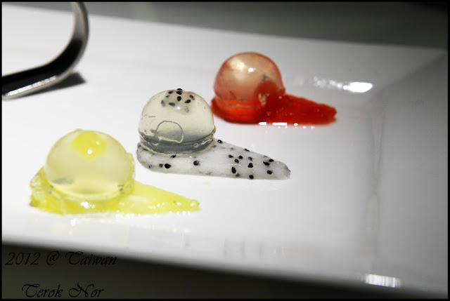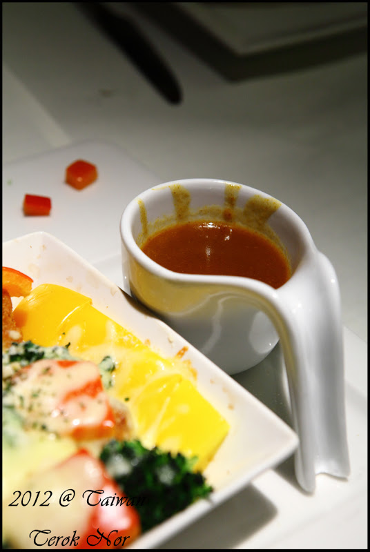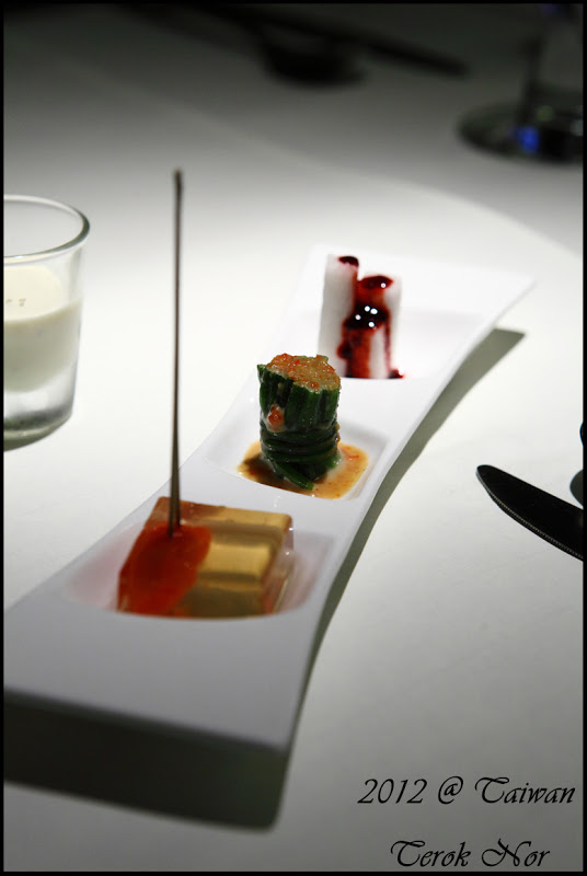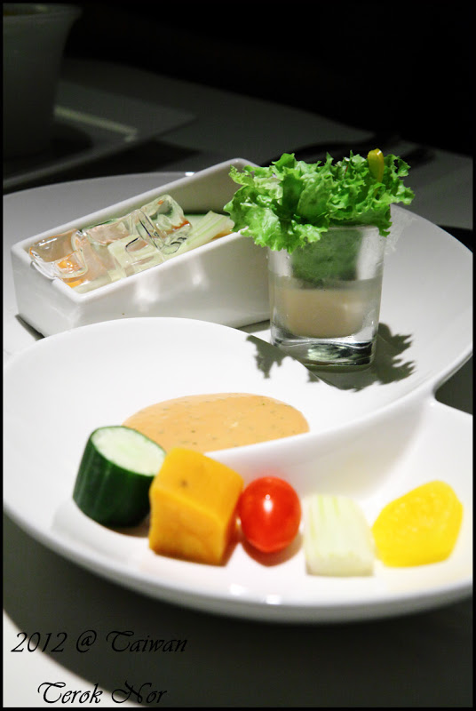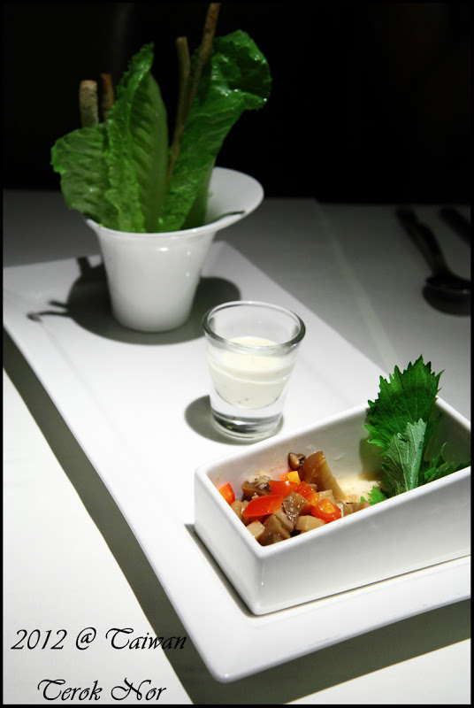 這是"前菜"視野上由近向遠依序為:蒟蒻蕃茄、彩椒水蓮、藍莓山藥!乍看之下,三樣前菜的份量都是三口內可以解決的份量;上菜時,服務生建議此三樣前菜的口味濃厚程度不一,食用時最好是由淡轉濃,從藍莓山藥開始進攻,在依序往彩椒水蓮、蒟蒻蕃茄前進,才不會因先食用了味道較濃郁的餐點而影響到後續品嘗。