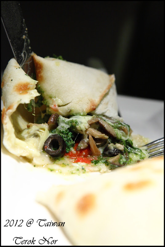 枕頭披薩的份量很大,外表上看起來很像一個用披薩皮做成的超大烤鍋貼,裡面的餡料則是青醬為底做出的菌菇、彩椒、黑橄欖、起司義大利青醬料,非常的美味呢!!