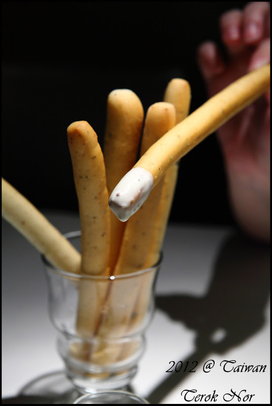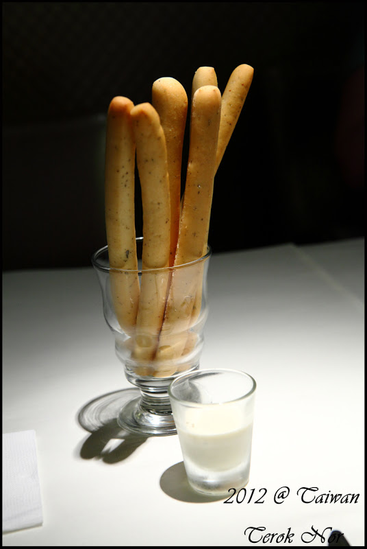 前菜之後上桌的是"迷迭香火柴麵包"迷迭香口味的長型麵包,在形狀上不僅方便拿取,也很方便沾取舒果附上的塔塔醬醬汁(只是,看舒果官方網站的照片,迷迭香火柴麵包附上的醬汁有藍莓醬跟塔塔醬兩種...... 不知道為什麼用餐這天只有塔塔醬一種?)