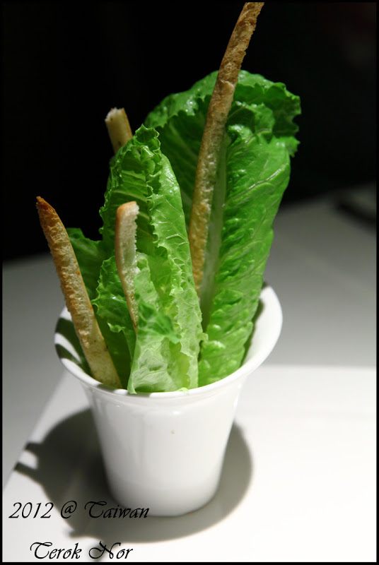 若是單獨只吃迷迭香火柴麵包,會覺得這麵包有點乾,迷迭香味有點濃,但麵包本身的麵粉味道卻沒有那麼的香甜;若是搭配了塔塔醬,則會覺得比較油的塔塔醬沒辦法融入火柴麵包內裡,但若是拿去沾前菜"藍莓山藥"在餐盤上遺留下來的藍莓醬,則是可搭配得恰恰好,不油不膩,酸酸甜甜的很美味呢!吃完了前菜跟麵包,接著上桌的便是"沙拉"!