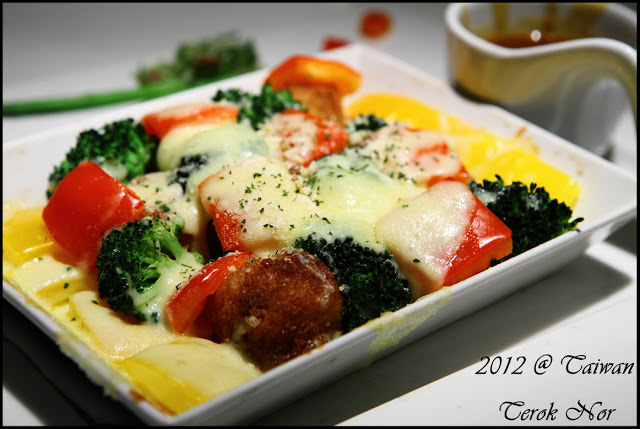 "彩蔬紅咖哩焗飯"做的很特別,他的焗飯不是在盤底鋪上一層米飯後再依序鋪彩椒、起司等下去做焗烤,出烤箱後在淋上咖哩;而是將米飯做成小方塊狀的下去六面煎烤,然後在放入盤中與青花菜、彩色花椒等一起擺盤、灑起司做焗烤!