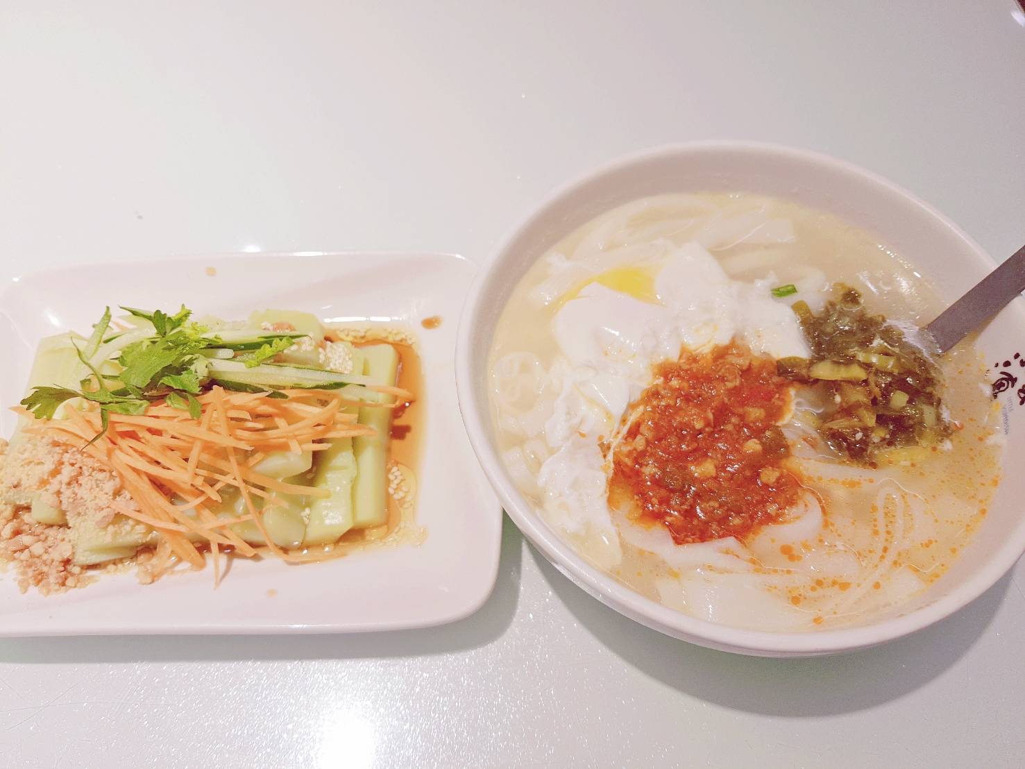 如果你吃不慣米干,也可以點過橋米線,原料相同,我帶去嚐過滋味的朋友,大概10組裡有一組會吃不慣米干,男生可能覺得不會飽~也可以加點大薄片、破酥包,破酥包不酥喔~皮是類似太陽餅那種偏粉的口感,我個人不愛;大薄片則是跟一般雲南料理店相同。