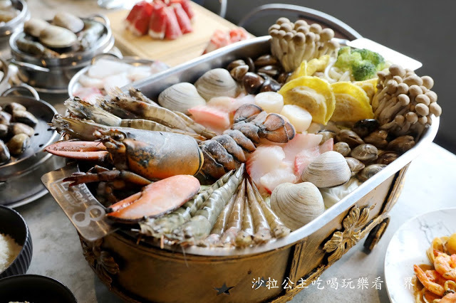 波士頓龍蝦、大草蝦、白蝦、鯛魚、蛤蜊、干貝、牛奶貝、季節時蔬、白飯、烏龍麵,滿滿一大鍋,我覺得我個人是抬不動的