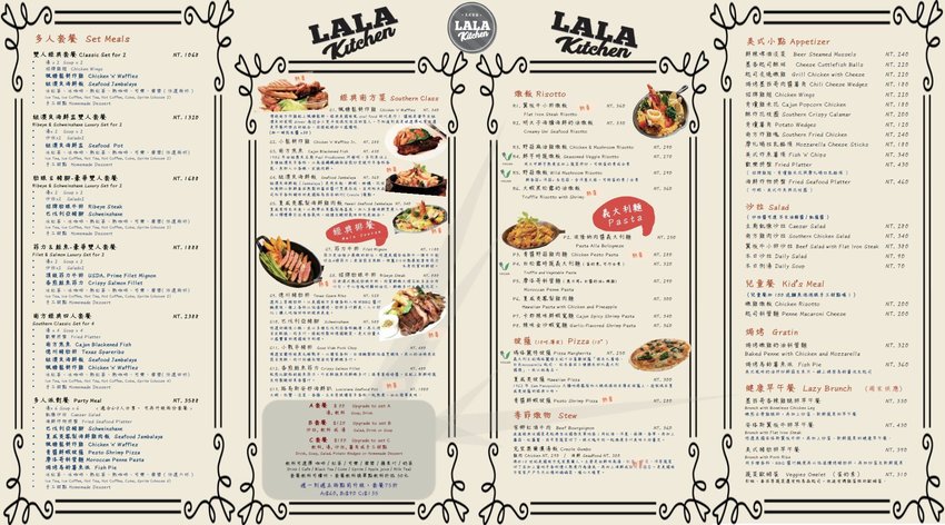 LALA Kitchen餐點的呈現非常多元化,除了有經典美國南方料理之外,還有排餐、燉飯、義大利麵、披薩、燉物、飲品、甜點等,周末更提供早午餐。