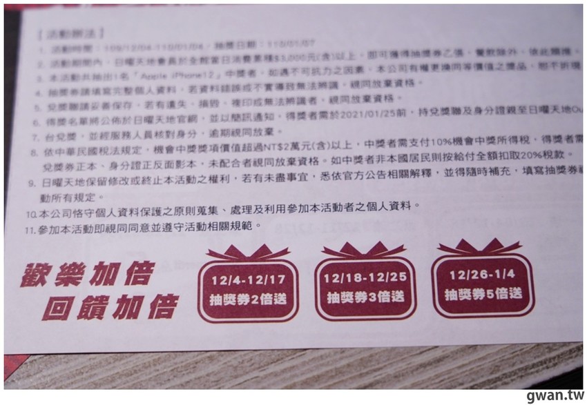 每週還有限定抽獎券加倍送,最高5倍,簡單說就是於12/26~1/4來消費的話,滿3000以上就直接領5張抽獎券喔