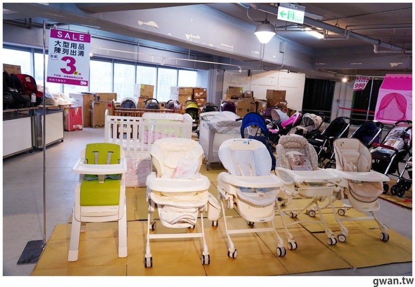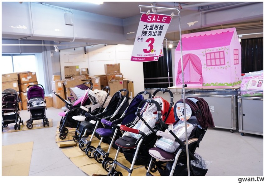最後方還有大型用品出清區,嬰兒床、寶寶座椅、推車、汽座都在這邊