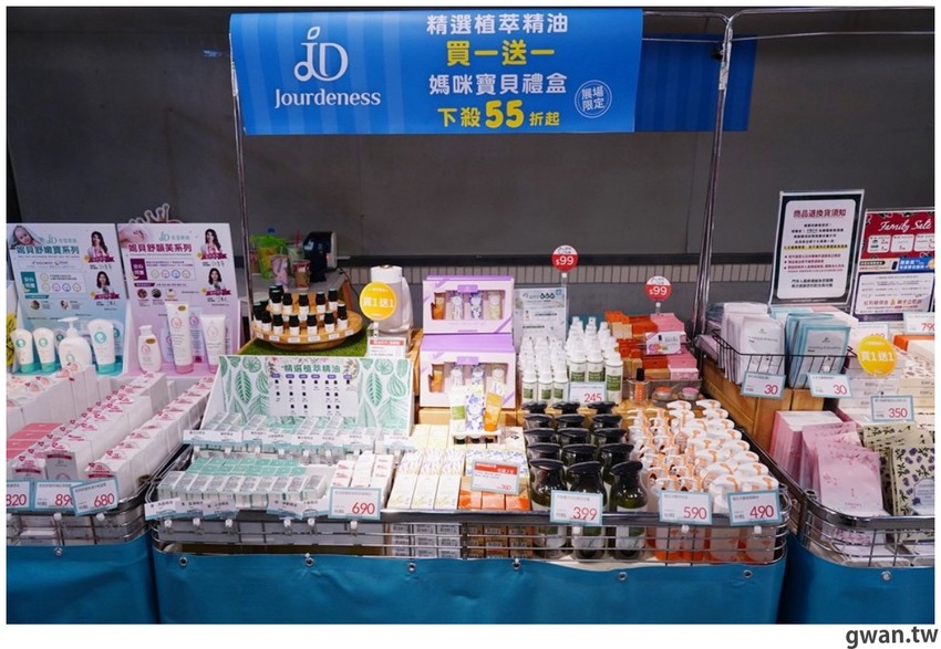 買一送一的花車陳列很多生活用品,像寶寶的洗髮、沐浴乳、抗菌泡泡洗手乳、奶瓶蔬果洗潔精…等等