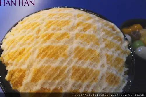 這滿滿刨冰上淋上煉乳與焦糖糖漿,很整齊互相交叉勾成菠蘿麵包外觀。