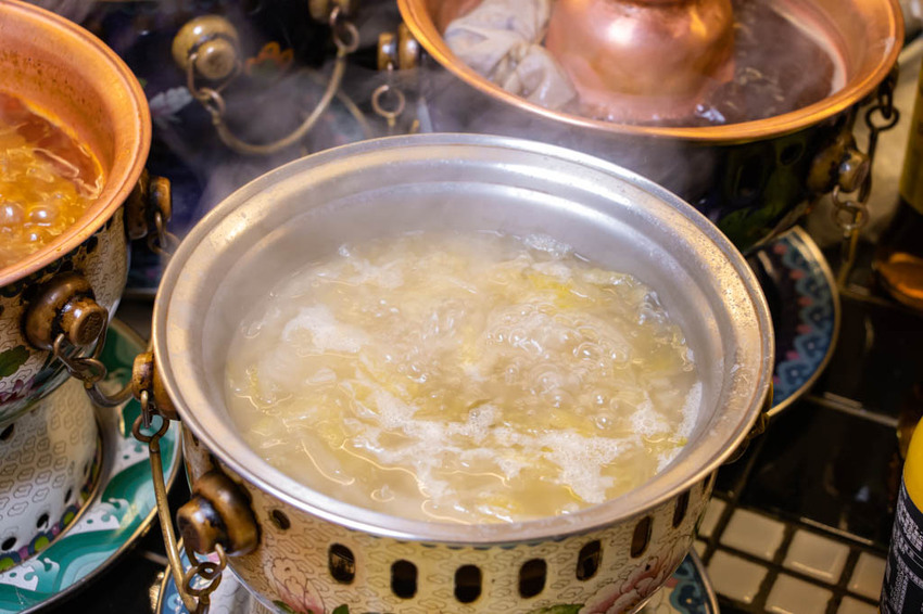 部門藥膳鍋,裡頭放了包中藥,朋友吃到後來才把藥包拿起來,而剛開始入口的湯頭帶點甘,微微的甜,吃到後來鹹度也很明顯,所以我們之後除了牛奶鍋,全都改加清湯頭。
