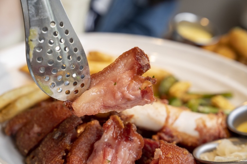 煙燻入味的豬後腳外皮香酥脆口,吃進嘴裡「喀滋喀滋」的口感超療癒,豬腳肉富有彈性,配上酸菜黃芥末醬等配料一起吃,豬腳肉肉香和酸菜完美結合,同時又有解膩的效果,整盤吃完超滿足!
