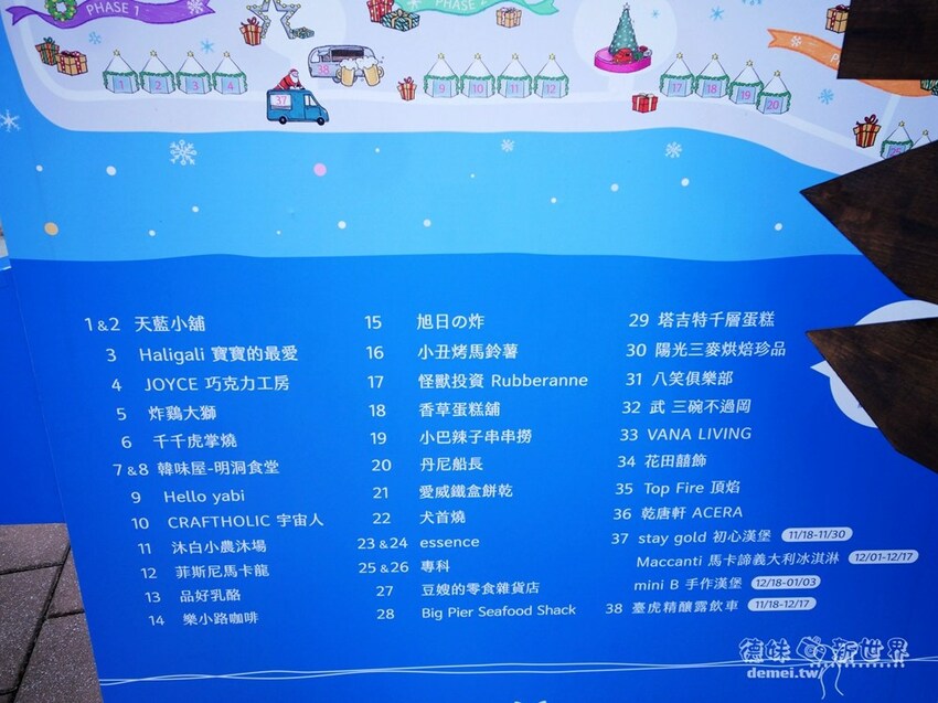 馬卡諦義大利冰淇淋(至12/17)、Mini B 手作漢堡(12/18~01/03)、臺虎精釀露飲車(至12/17)。