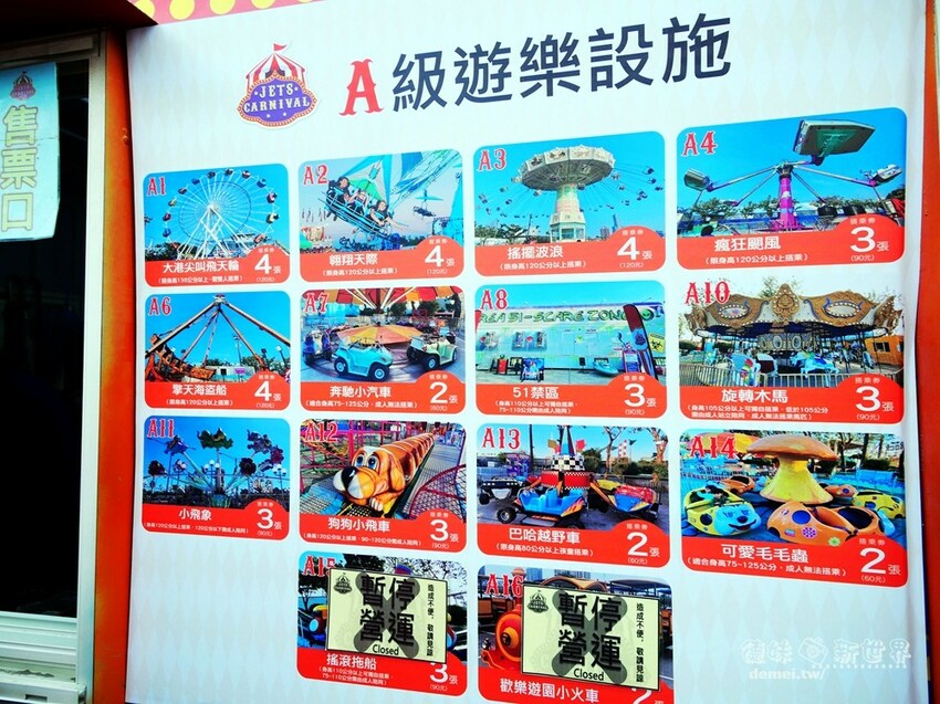 以2張($60元)、3張($90元)、4張($120元)不等,每樣設施都有標明身高限制,