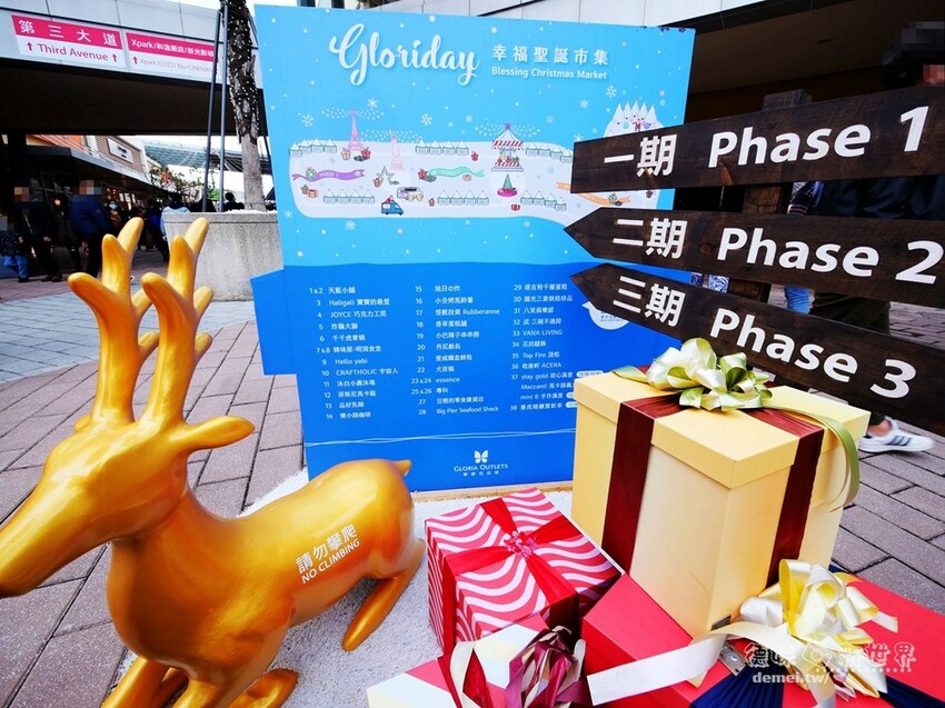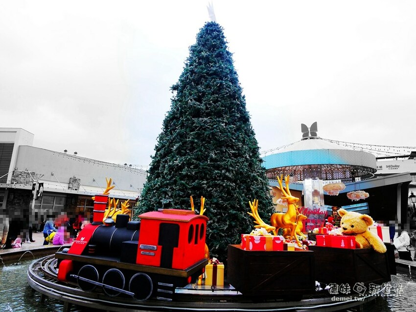 一期的自由女神、二期的8米高耶誕樹與小火車、三期的巨大閃亮禮物盒都是好拍點。