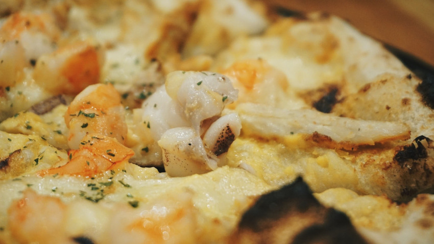 GUMGUM內科店的PIZZA餅皮為薄皮,焦脆的外緣嚼著嚼著有股麵粉香,食材完整性很高,沒有被切的很零碎,滿滿的海鮮大平台。