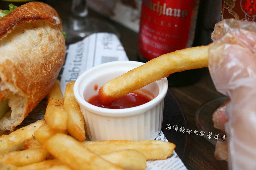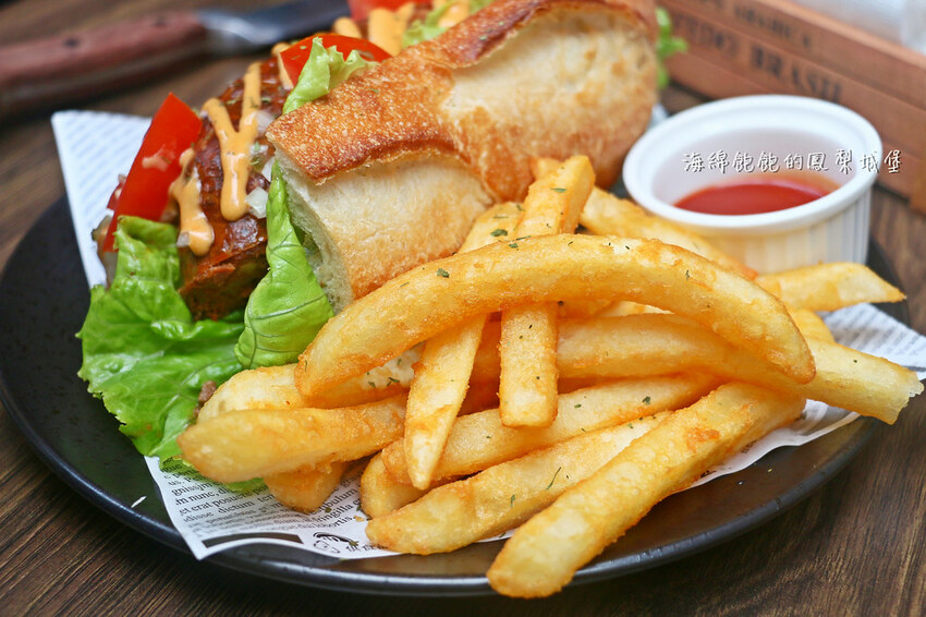 漢堡旁邊附有薯條,剛上桌熱騰騰的外酥內鬆。單吃或是沾一點番茄醬就很好吃!