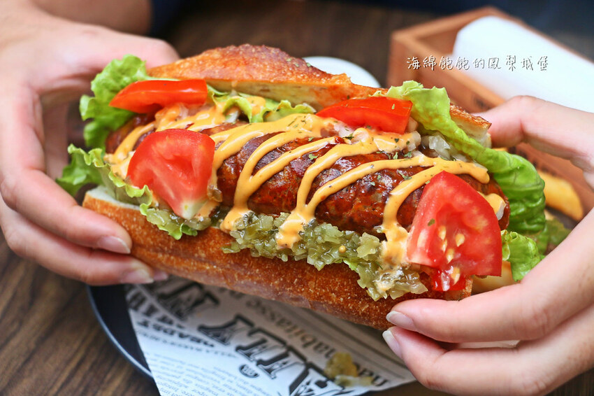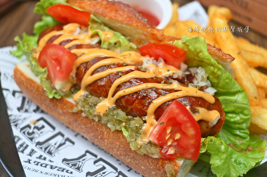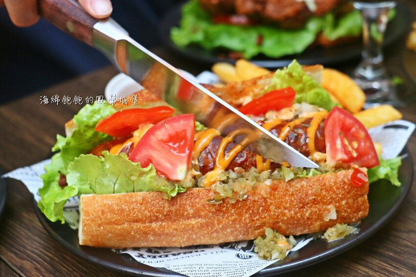 有別於常見的熱狗堡,麵包使用法式長棍麵包。口感上多了一分脆度與咀嚼的香氣!