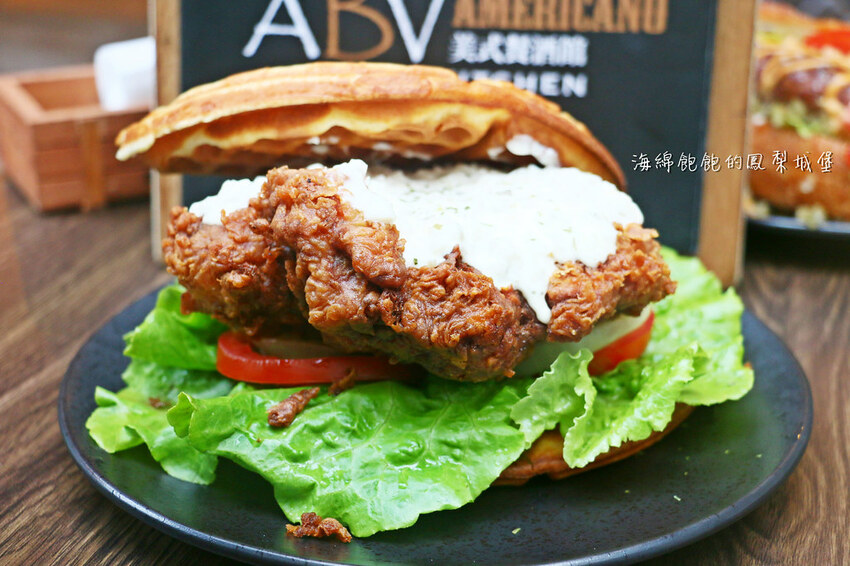 用酥脆的蜂蜜奶油厚鬆餅,中間夾著酥脆的超大塊炸雞腿排。搭配酸黃瓜、美乃滋、水煮蛋製作而成的塔塔醬