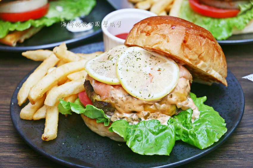 貪心大口咬下8盎司的純牛漢堡排與煙燻鮭魚。小朋友才做選擇,大人就是海陸大餐全部都要!