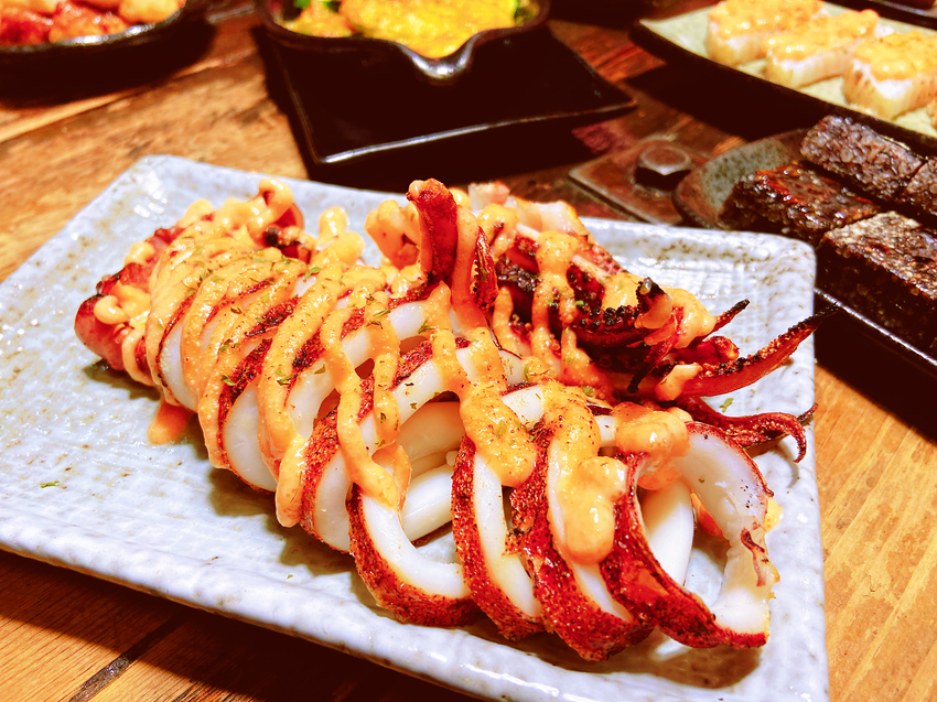 🌕明太子中卷$200 淋上明太子醬料的新鮮中卷 炙燒過後能保有Q彈水份,鮮嫩多汁不錯!
