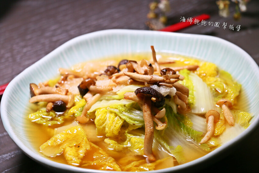 帶有脆度的小白菜吸附飽滿湯汁,搭配野菇增加口感