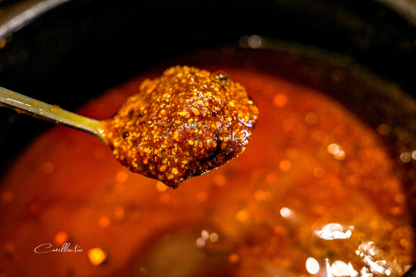 麻辣湯底的熬製過程也非常花功夫,基底材料一樣是使用雞骨、洋蔥、蒜,另外再加上十幾種中藥材,如:當歸、陳皮、小茴、黃耆、甘草、八角等,先熬約 4 個小時完成基底,再以獨家的麻辣醬、花椒、大紅袍,浸泡米酒不斷拌炒,費時費工熬製成的麻辣湯頭喝起來溫醇且香,沒有太過辛辣刺激的味道,和平時吃到的麻辣鍋不同,甚至可以直接喝湯。
