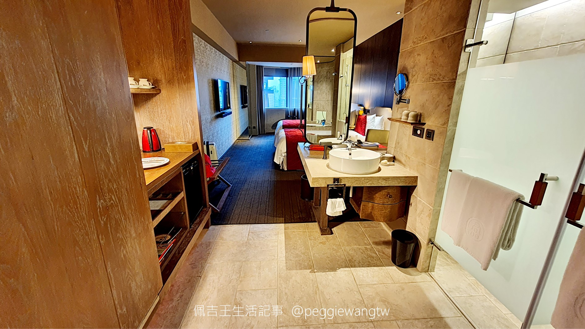 | 圖:我們入住的是兩小床豪華客房,一進門映入眼簾的是洗手台,右邊為淋浴間、廁所、浴缸;左邊是衣櫃、MINI BAR |