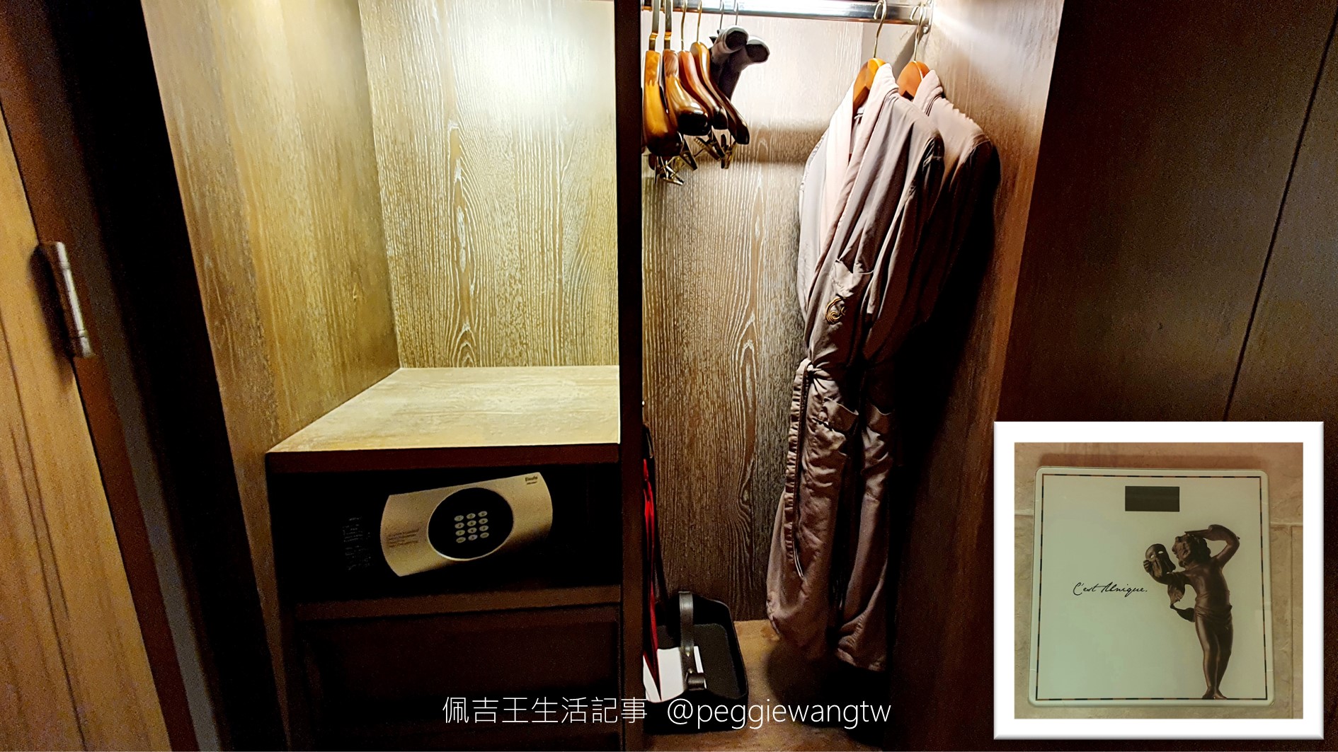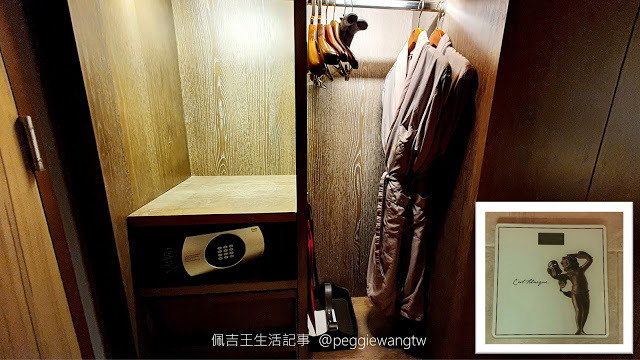 | 圖:入口處是衣櫃、保險箱。衣櫃門和MINI BAR門是同一個移動門;想放衣服,就不能用MINI BAR,使用MINI BAR就不能開衣櫃,十分會利用空間呢~ |