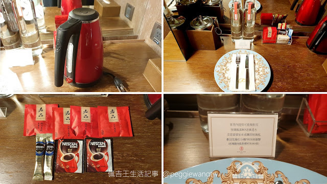 | 圖:MINI BAR:熱水壺、歐式古典餐盤、君品茶包、雀巢即溶咖啡(感覺有點弱了)、兩瓶玻璃瓶裝水。為了環保,沒提供一般寶特瓶礦泉水,若需要補充飲水,可CALL客房服務。而我們這次總共叫了兩次共四瓶水。 |