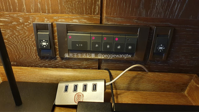 | 圖:床頭USB插座和燈光控制開關。燈光開關啟動有點慢,又是分段式光源,急性子的我,剛開始以為壞掉,差點要叫客房服務了XD |