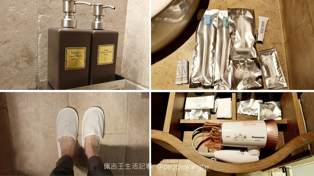 | 圖:洗髮精和沐浴乳是同一罐、潤髮乳是單獨一罐(左上),不織布厚拖鞋(左下),牙刷牙膏刮鬍刀棉花棒髮帽(右上),P牌吹風機,基本上備品與一般商務飯店大同小異。 |