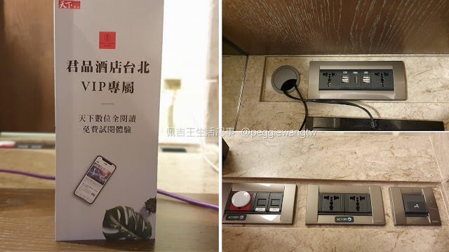 | 圖:除了床頭的USB插座,另一可充電處就是書桌了。建議大家,可以好好利用君品提供的免費天下數位閱讀,加入天下會員開通帳號後,就可以享受一個月的免費閱讀喔~(ノ>ω<)ノ |