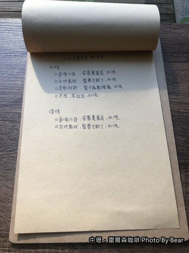 後面兩頁都是單品咖啡,有分淺、中、深焙三種焙度可選擇,均一價都是$180