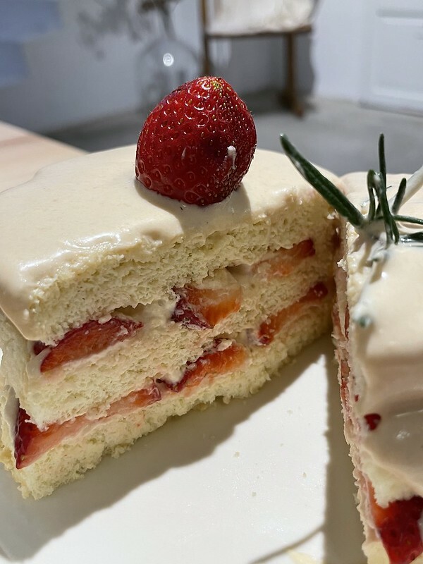 滿滿的焦糖覆蓋著蛋糕,除了上頭的草莓外,
