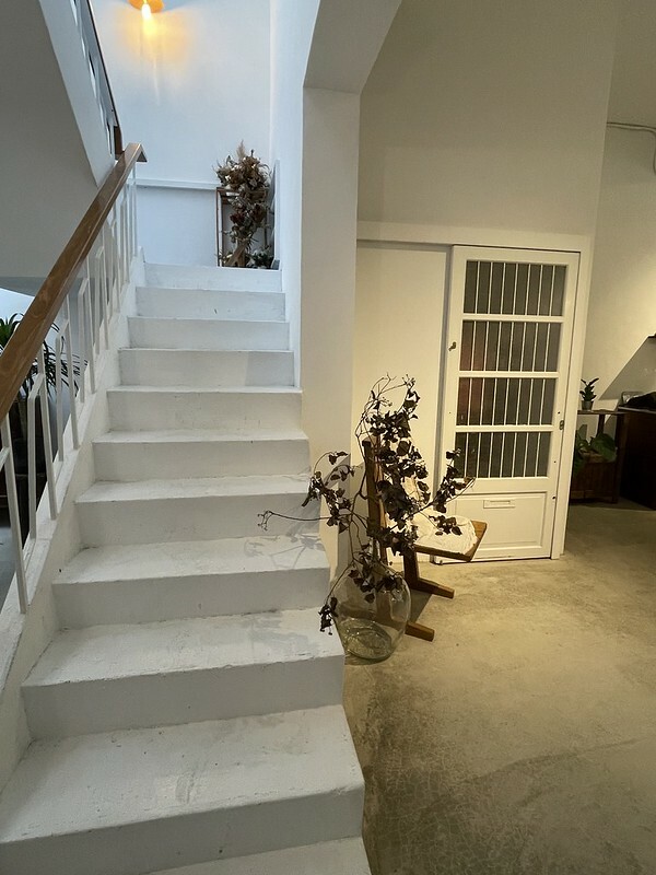 樓梯旁,洗手間旁的空間,有張椅子、布、乾燥花....搭配的造景;