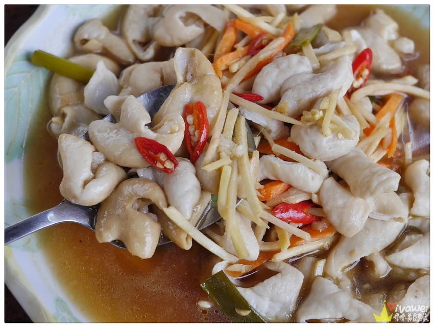 ▲薑絲炒大腸選用當日新鮮豬大腸的後段,切成三角形狀,川燙後快炒!要炒到豬腸砰砰的口感~火侯控制可是非常重要的一環~這就是主廚多年累積的功夫啦!脆中帶勁的豬大腸, 搭配了酸酸的特製醬汁,十分夠味!