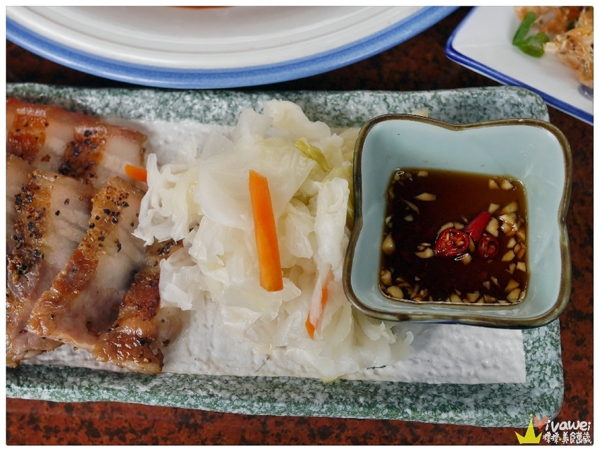 ▲厚度剛剛好的鹹豬肉醃製的很入味,一旁還有爽脆的台式泡菜和蒜頭辣椒醬油搭配!無論要單吃或是配飯吃都很讚~是我今天很愛的一道菜色😋