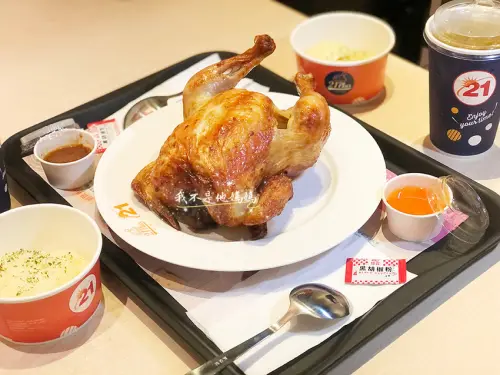 ↑新店家樂福店的21世紀風味館就在美食街,烤雞套餐約400元附贈薯泥和兩杯飲料