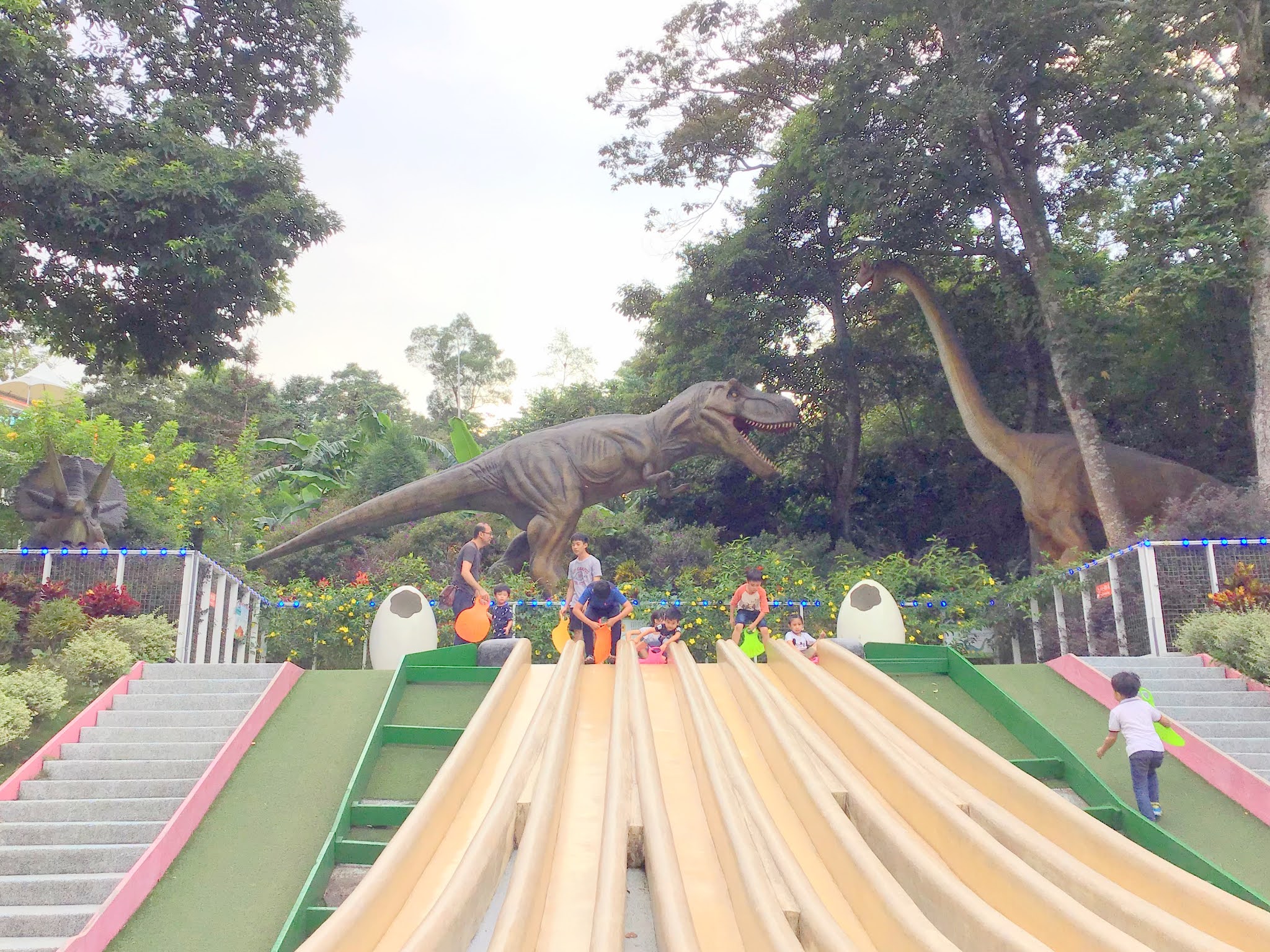 超大型恐龍模型殿後,家長們忙著幫小小孩扶正,上下