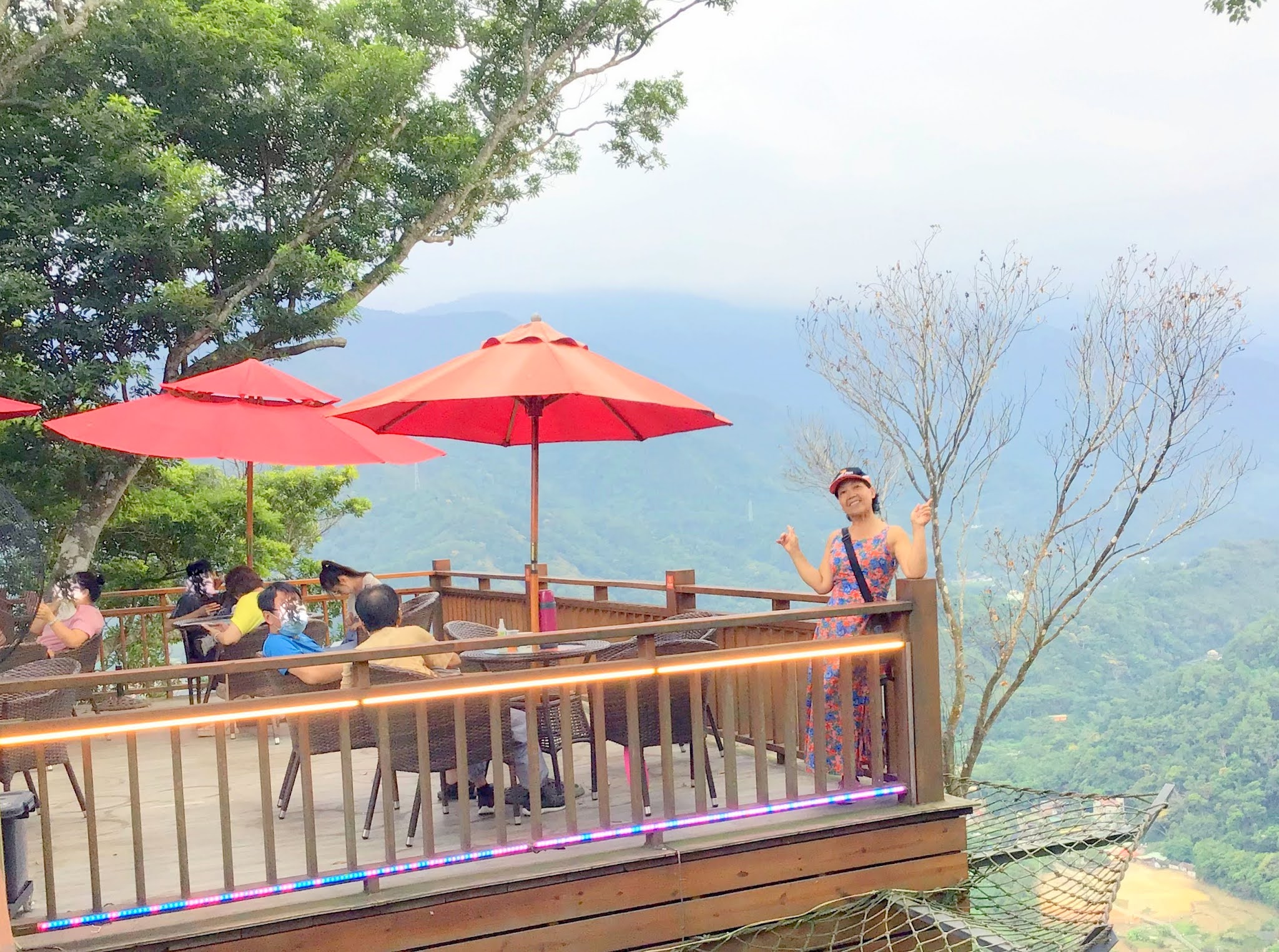 大紅色太陽傘映著藍天、白雲、青山、綠葉....這個