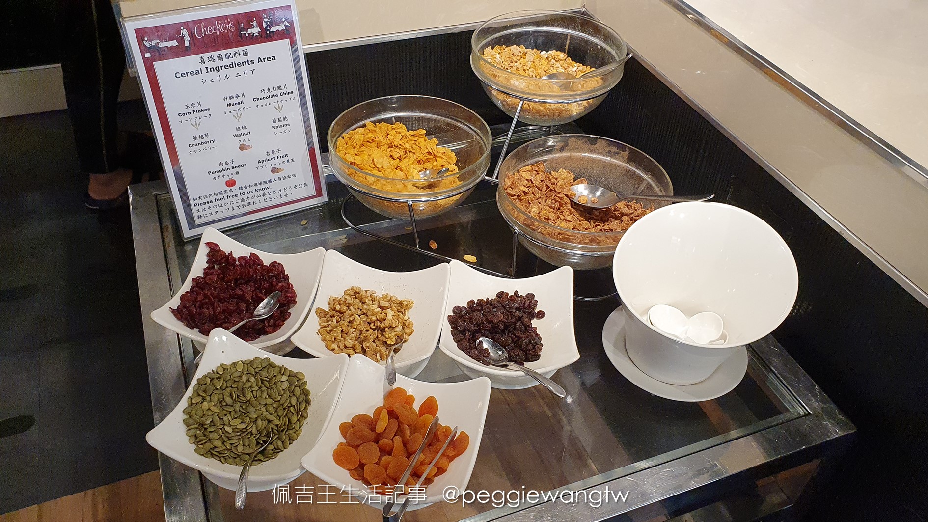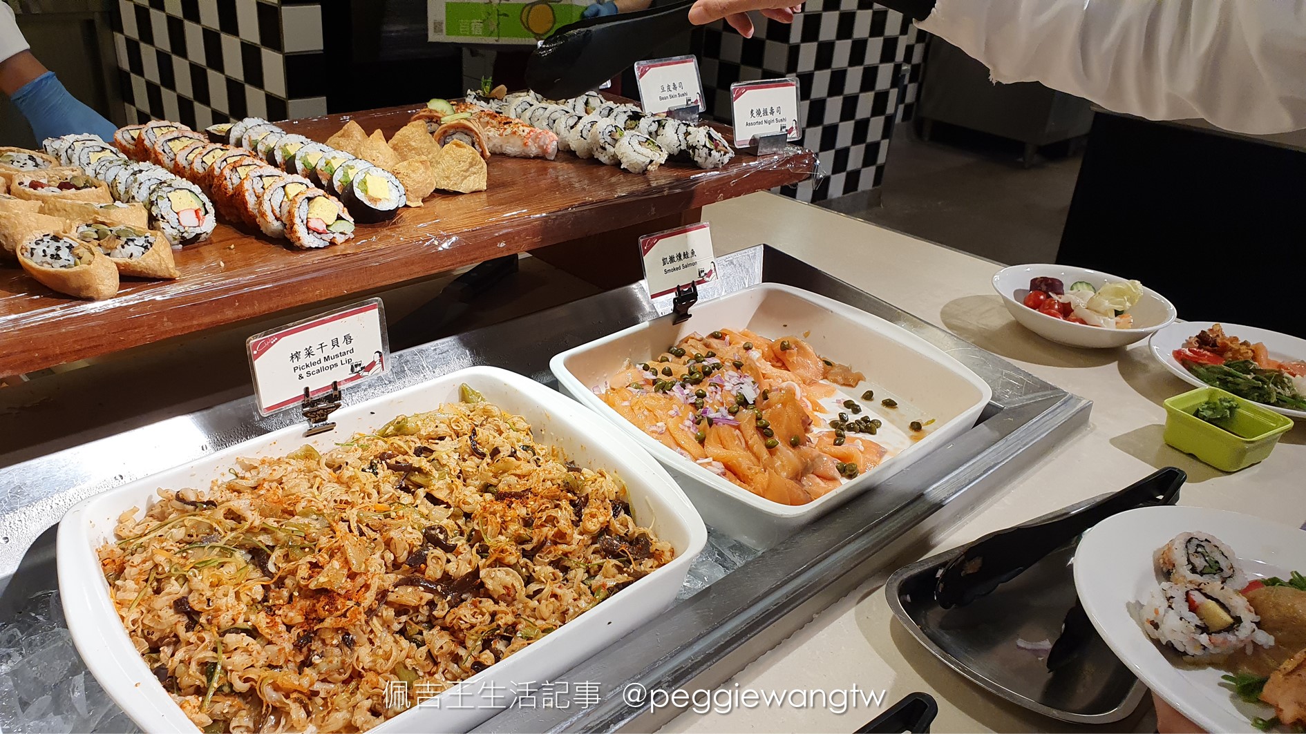 餐廳分為兩區,入口往左走為冷食區和往右走為熱食區。晚餐期間兩區都有豐盛餐點,尤其是冷食區有早餐沒有的甜點與生魚片、日料、海鮮等。