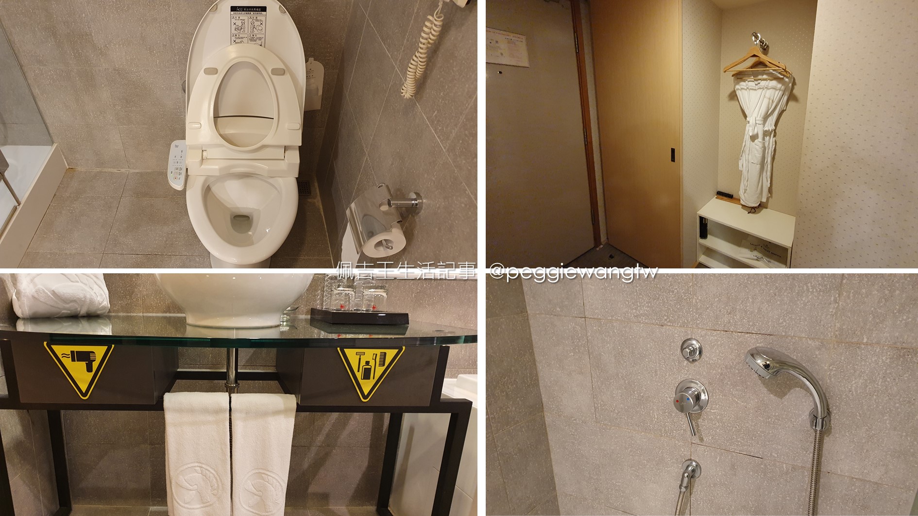| 圖:免治馬桶、淋浴間花灑、門旁衣帽間掛有浴袍 |