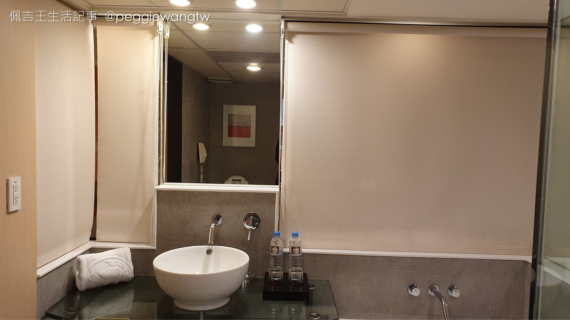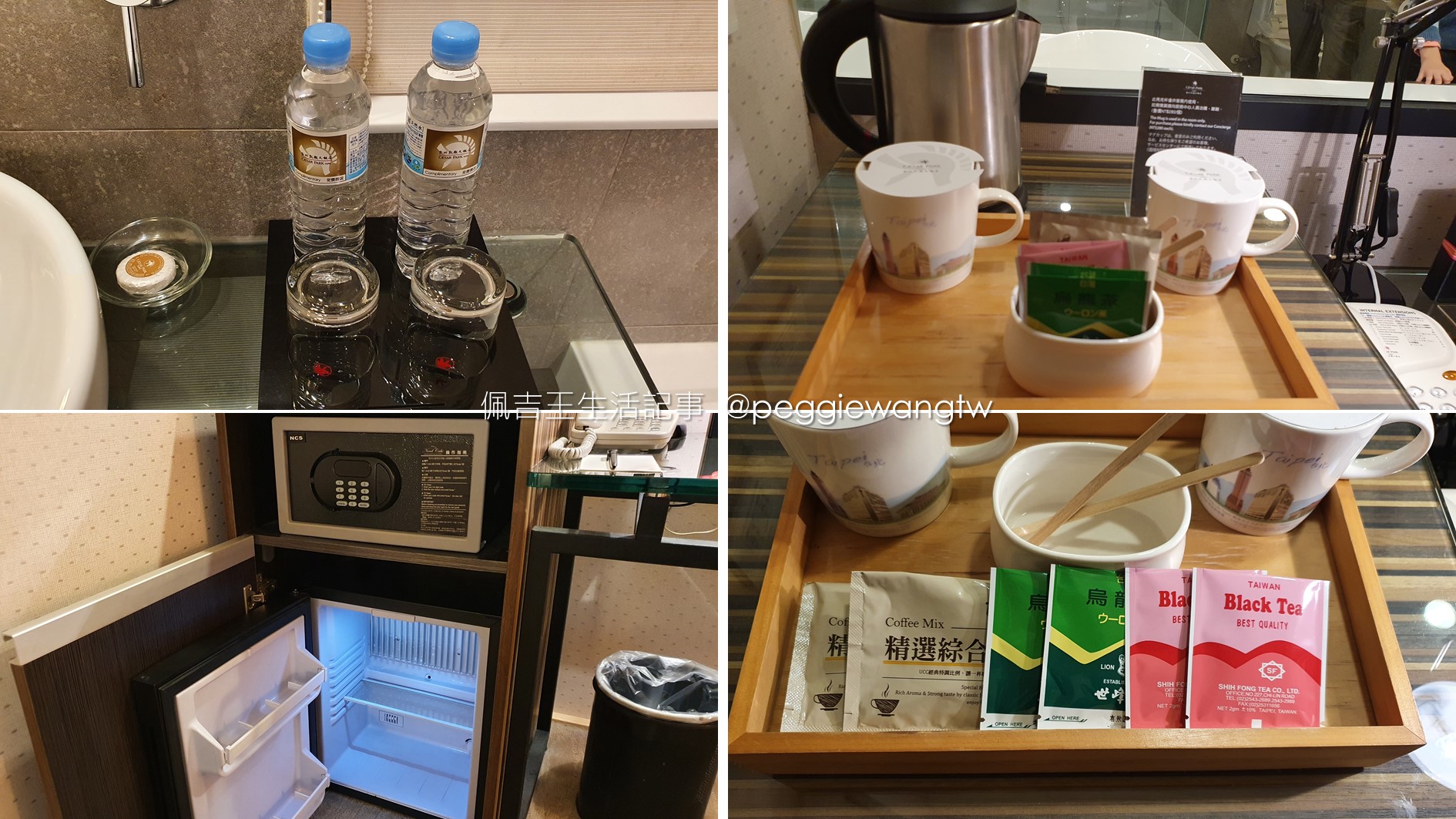 | 圖:基本上附兩瓶水(在浴室),MINI BAR是三合一咖啡和茶包,保險箱在冰箱上 |