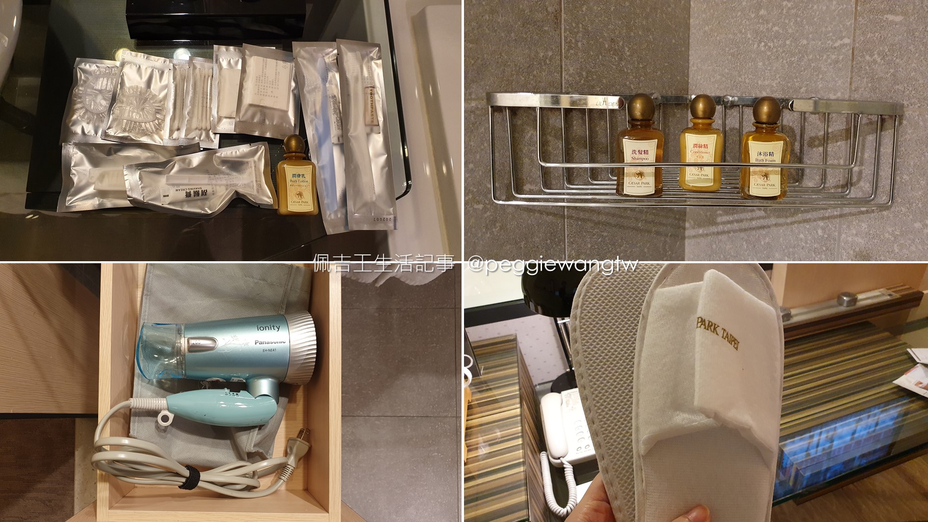 | 圖:備品包含牙刷牙膏、刮鬍刀、摺疊梳、棉花棒化妝棉、浴帽,乳液、洗髮乳、潤髮乳、沐浴乳、P牌吹風機、厚拖鞋。 |