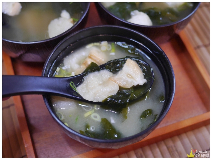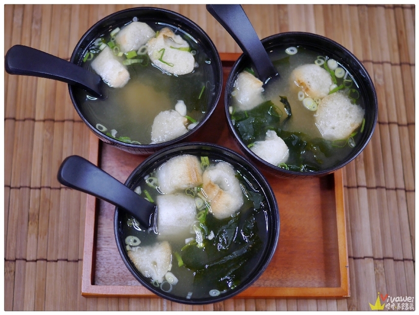 ▲套餐附贈的海帶味噌湯,裡面加了些蔥花點綴,上面還有像是麵包丁的麩,吸附湯汁後的口感蠻特別的!