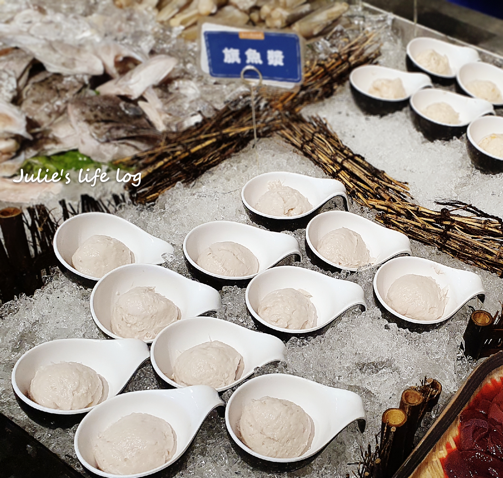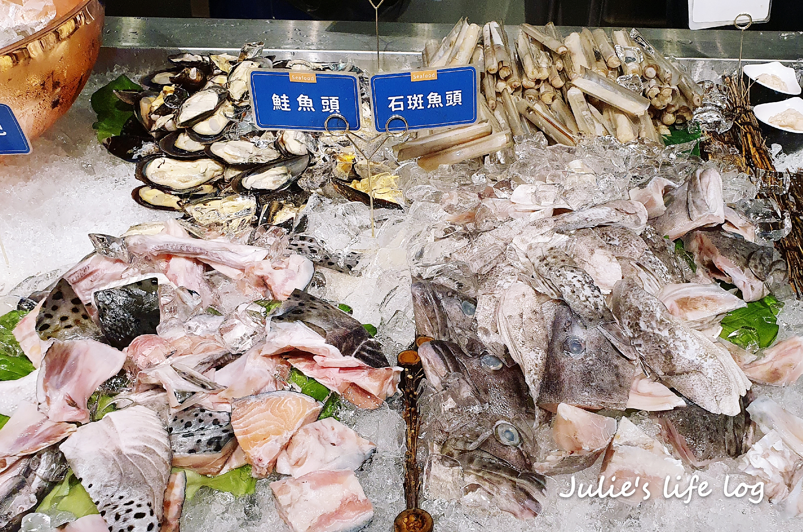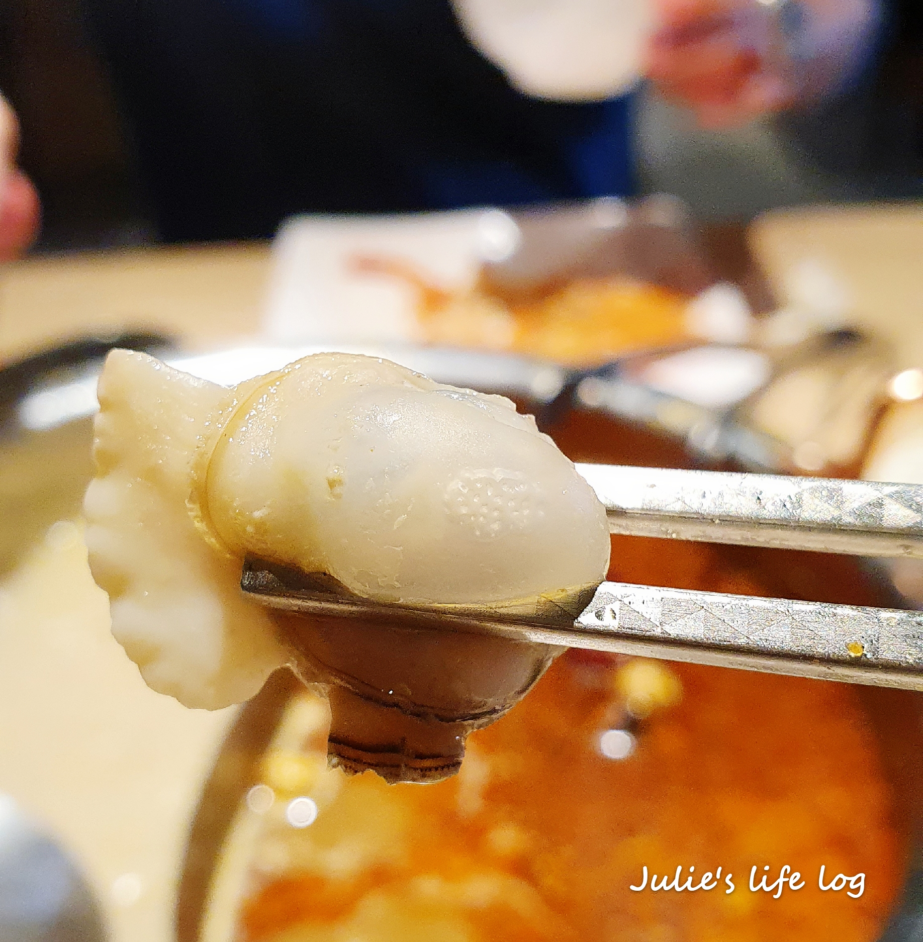 海鮮種類滿多的,鮭魚頭、石斑魚投、淡菜,右後方外型像竹子的叫做「竹蛤」,去海產店常看到,但我第一次在吃到飽的火鍋店看到這種食材!