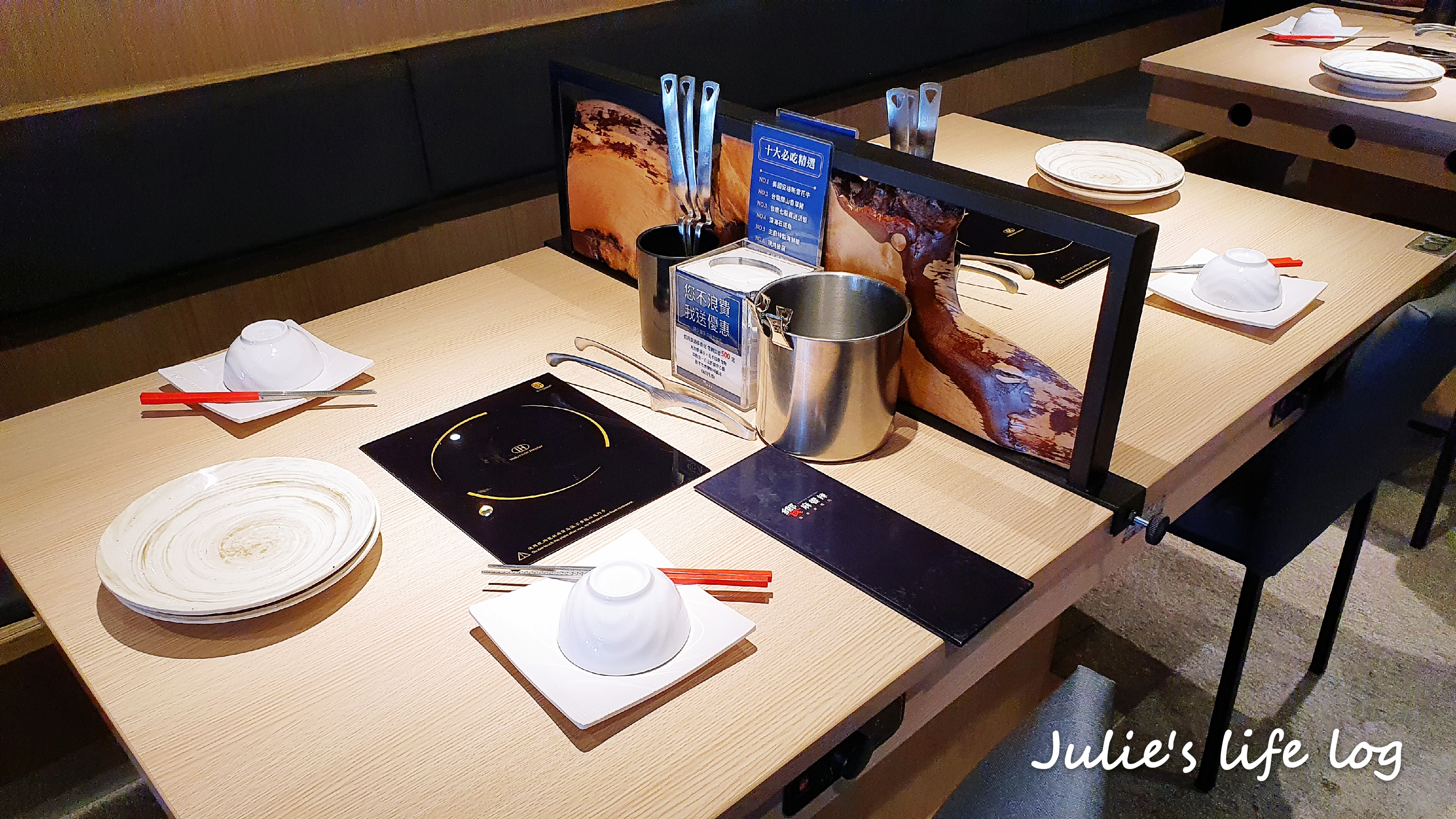 今天拋棄小孩來吃大餐,兩人共用一個電磁爐,桌上有垃圾桶、湯勺,兩個夾子用來點現切肉片,服務人員切好後會送到桌邊。